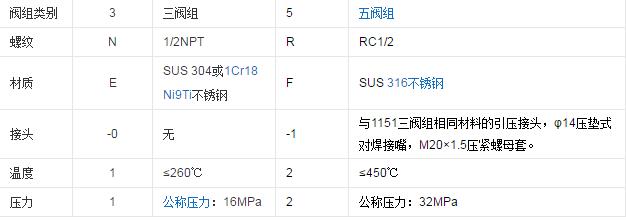 三阀组的阀体型号三阀组是由三个互相沟通的三个阀组成。根据每个阀在系统中所起的作用可分为:左边为高压阀,右边为低压阀,中间为平衡阀。三阀组与差变送器配套使用,作用是将正、负压测量室与引压点导通或断开;或将正负压测量室断开或导通。